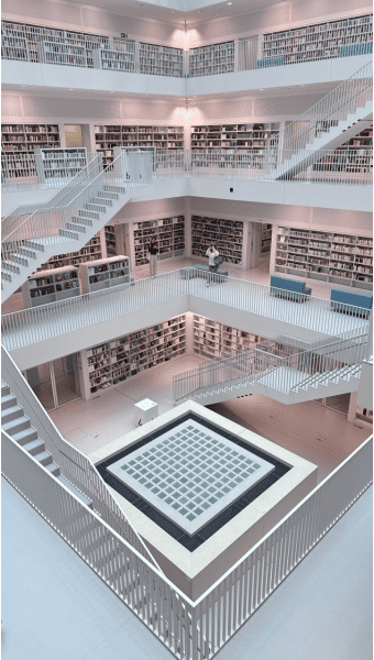 2011년 개관한 슈투트가르트 시립 도서관은 외형부터 이목을 끄는 완벽한 정육면체 건물로, 순백의 외벽과 내부가 독특한 분위기를 자아냅니다.